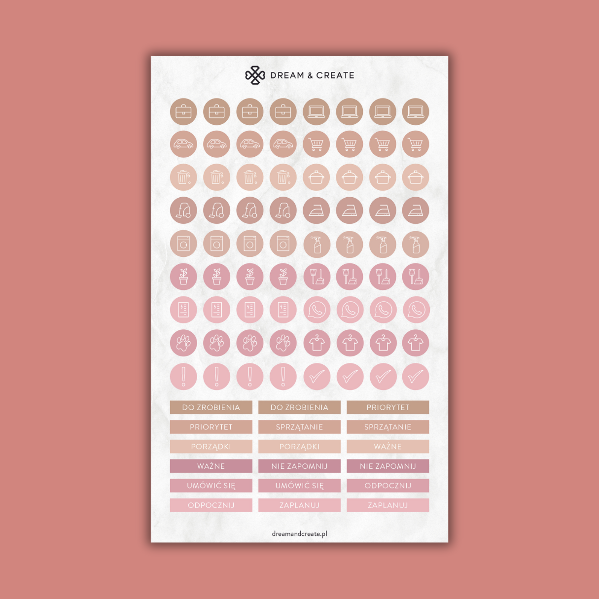 • przepiękny kobiecy i elegancki projekt z ikonami i hasłami związanymi z obowiązkami.